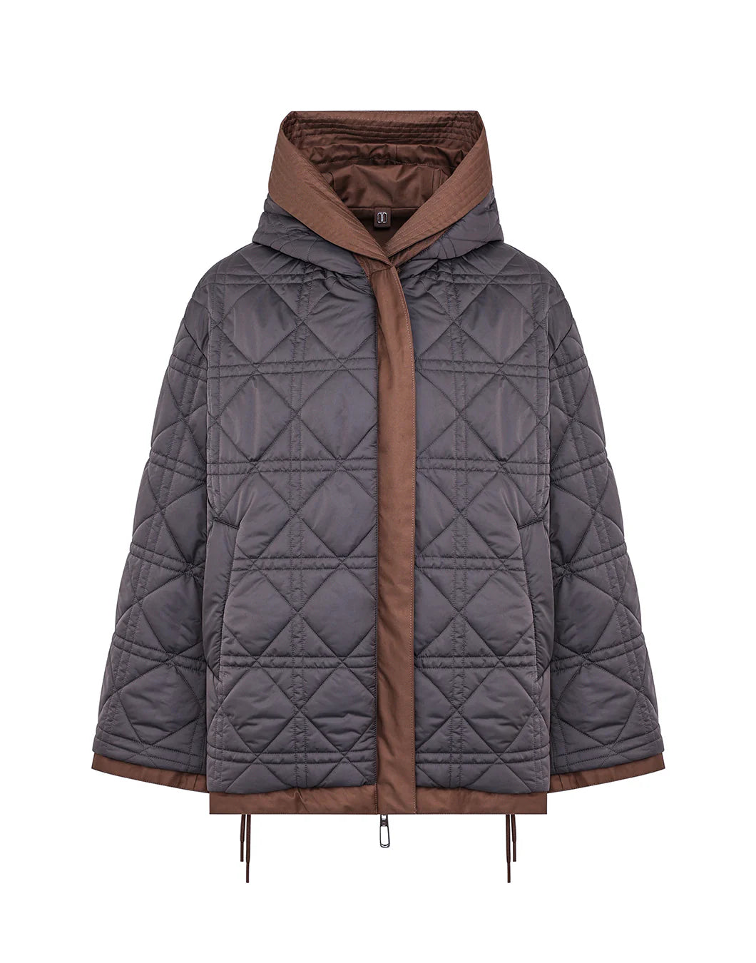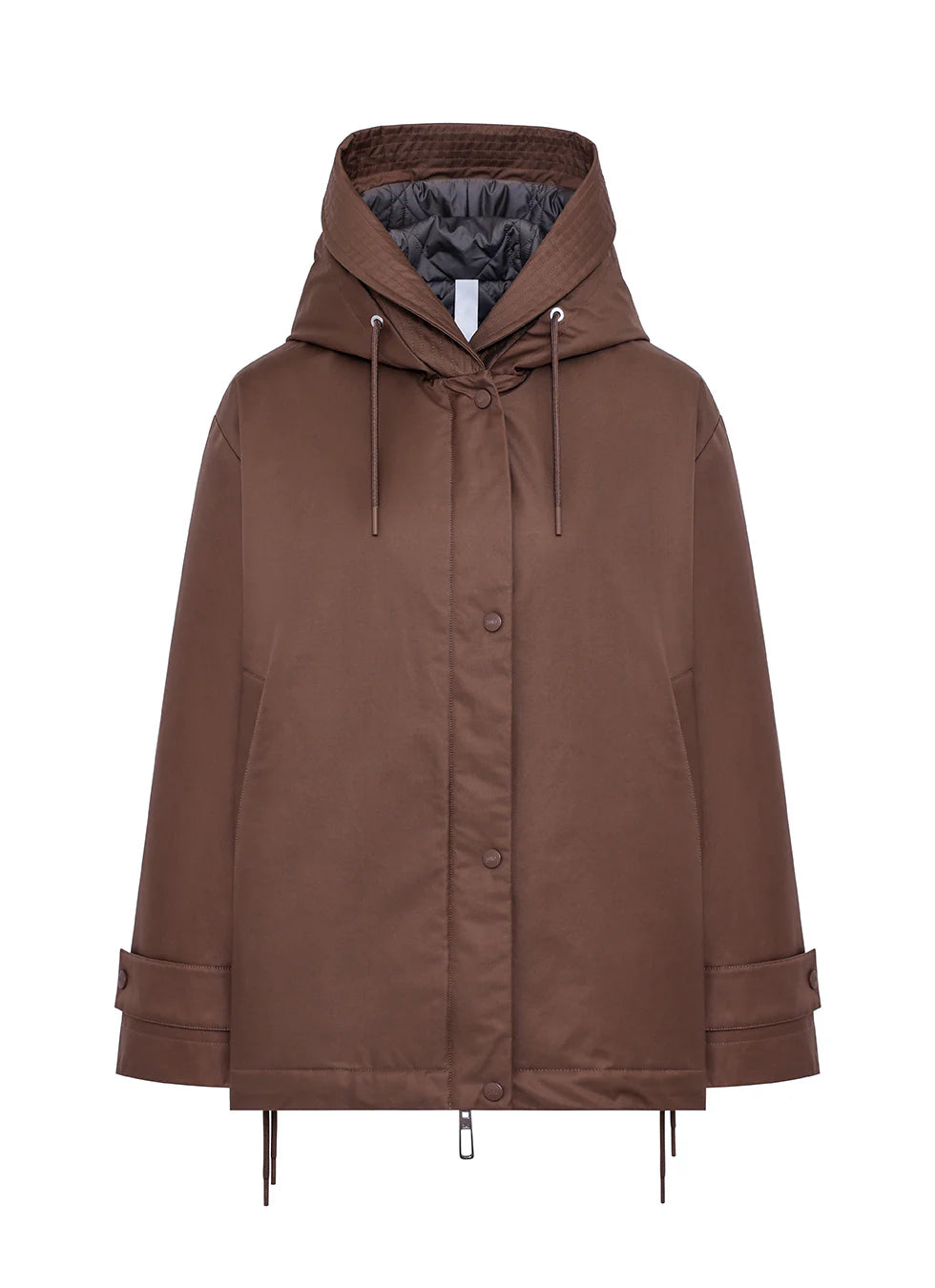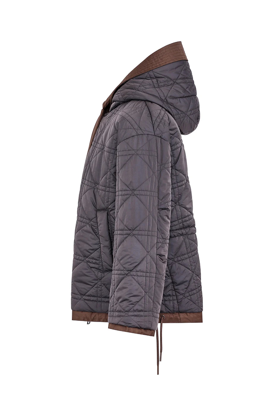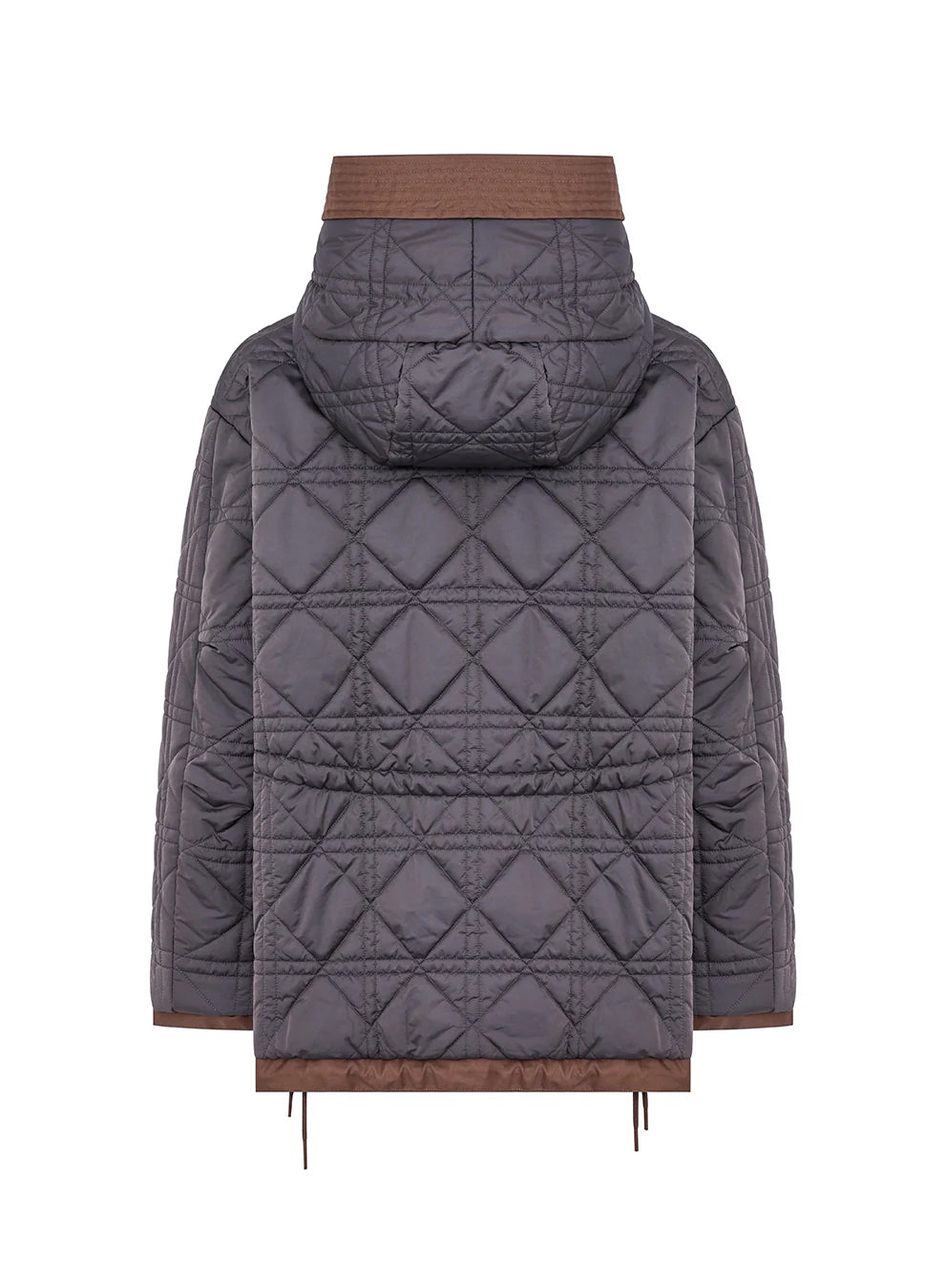 Giacca oversize reversibile con imbottitura sintetica e ampio cappuccio con tesa ripiegabile. Il lato principale, realizzato in tessuto di cotone tecnico 3-Layer, è caratterizzato da doppia chiusura frontale con automatici e zip doppio cursore nascosta da patta, tasche laterali a filetto con automatico e ampio fondo manica regolabile con laccio chiuso da automatico. All’interno trapunta di tessuto tecnico superlight con disegno geometrico e tasche laterali a filetto con automatico. Coulisse al fondo e alla vita per regolare la vestibilità del capo.