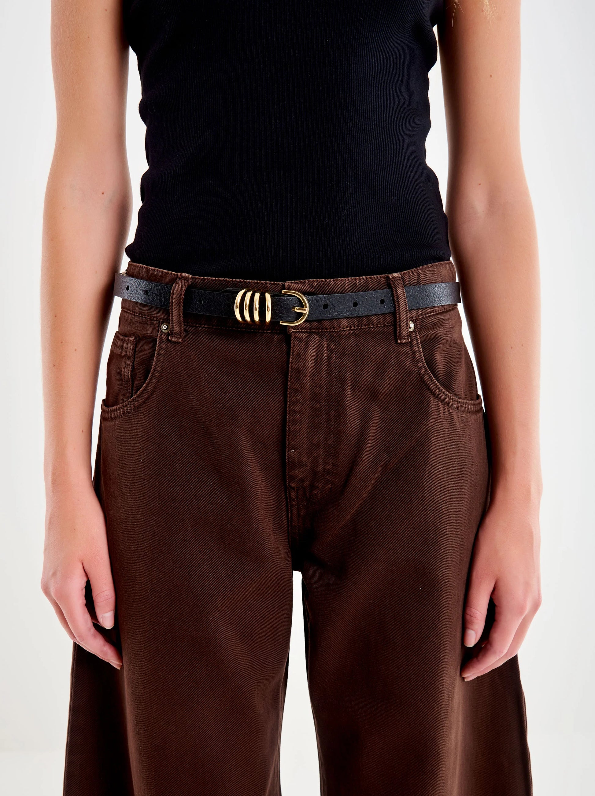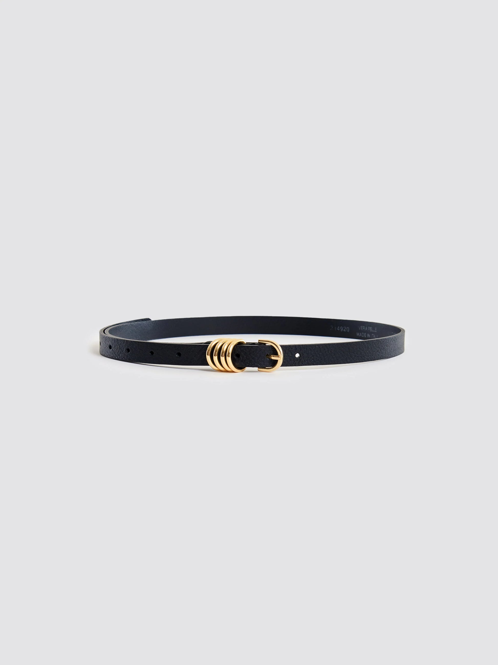 Cintura in vera pelle con anelli dorati. Chiusura con fibbia.