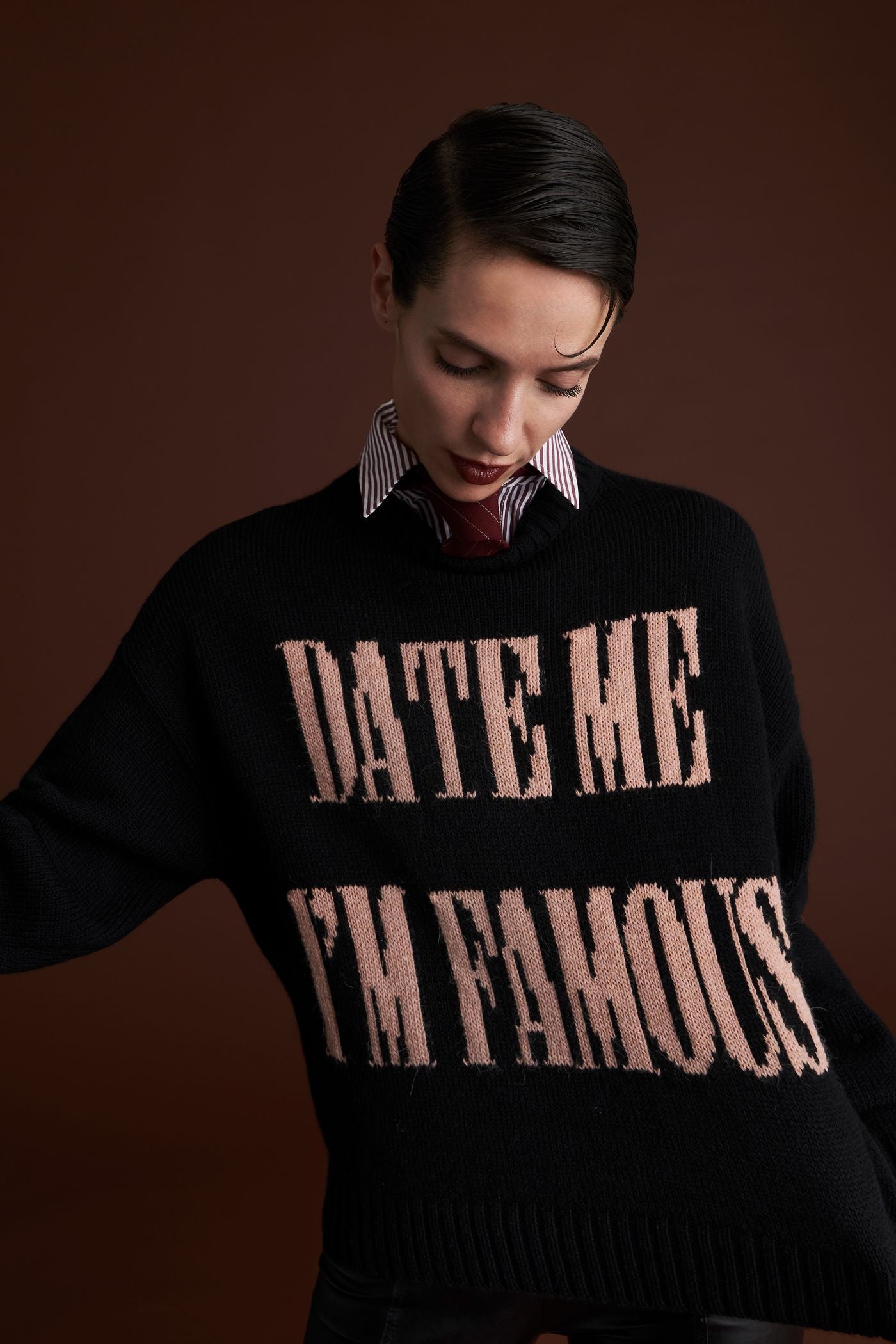 IRRIVERENTE E SENZA FILTRI. IL MAGLIONE KOLOR LANCIA IL SUO MESSAGGIO A CARATTERI CUBITALI CON IL LETTERING RICAMATO JACQUARD "DATE ME I’M FAMOUS". IL FIT COMODO E LA PALETTE A CONTRASTO FANNO DA CORNICE A UN CAPO CHE NON PASSA INOSSERVATO.