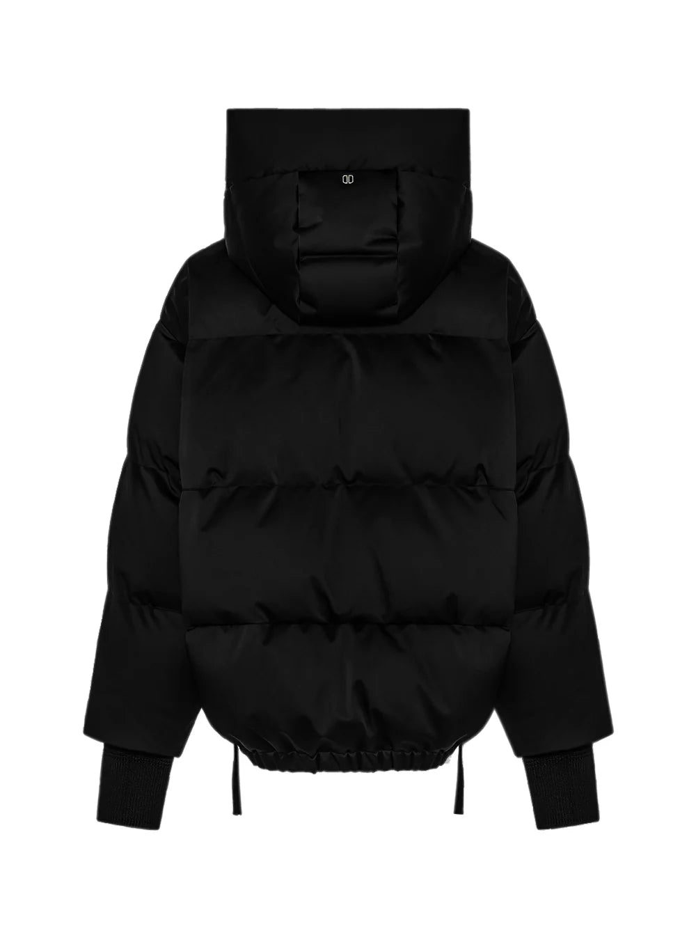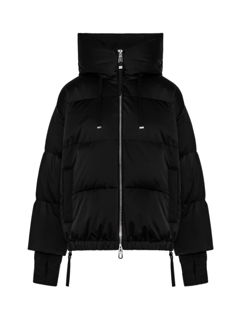 Piumino corto oversize in raso tecnico con cappuccio regolabile con coulisse. Il capo è caratterizzato da fianchi apribili e regolabili tramite zip, elastico nascosto al fondo e polsi lunghi in maglia di lana con passaggio per il pollice indossabili come muffole. Tasche laterali a filetto con automatico nascosto, chiusura frontale con zip doppio cursore con dettaglio di tirazip e sottozip con cucitura zigzag.