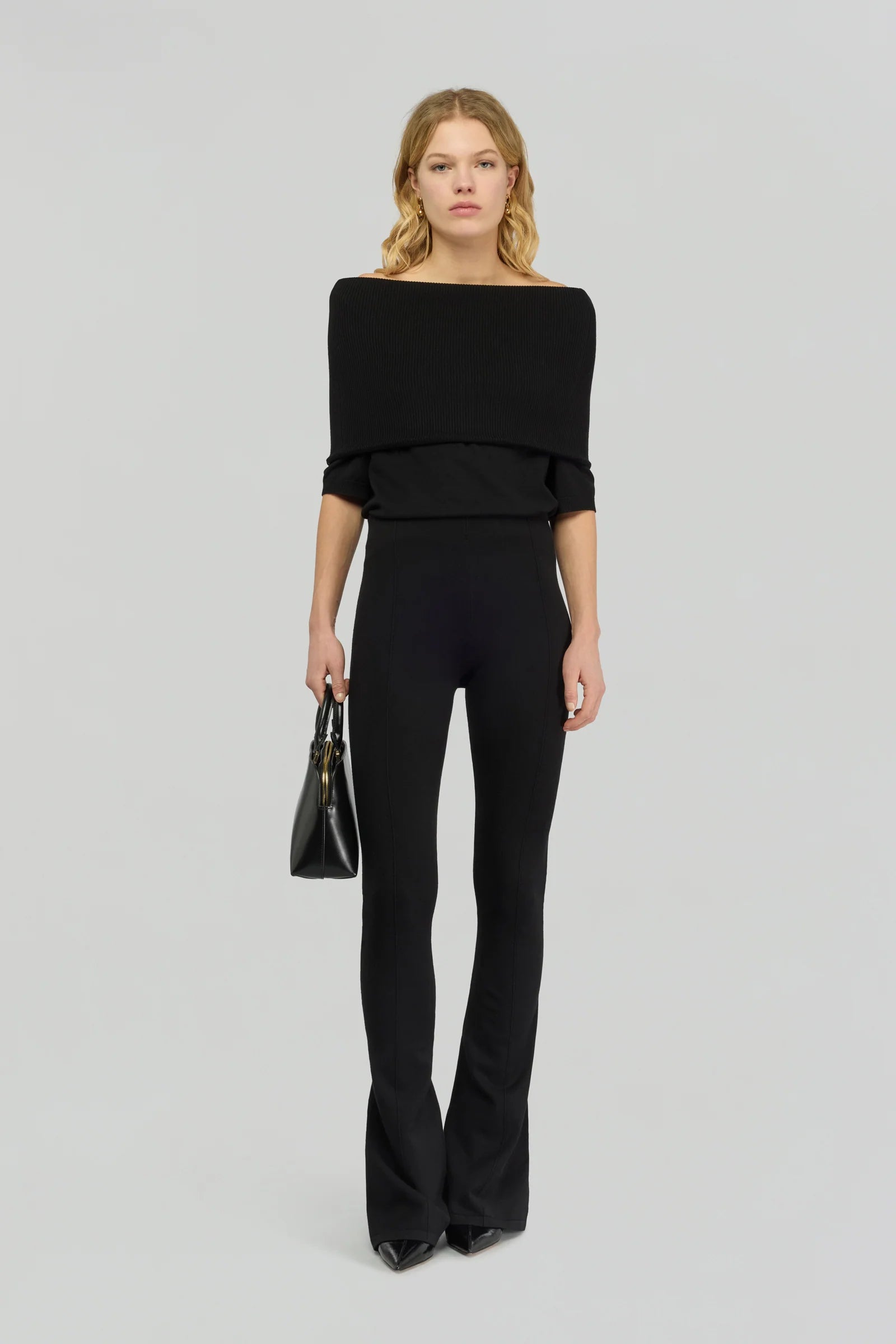Maglia in viscosa elasticizzata, ampia scollatura bardot. Manica a tre quarti. Vestibilità  aderente, lunghezza bacino.