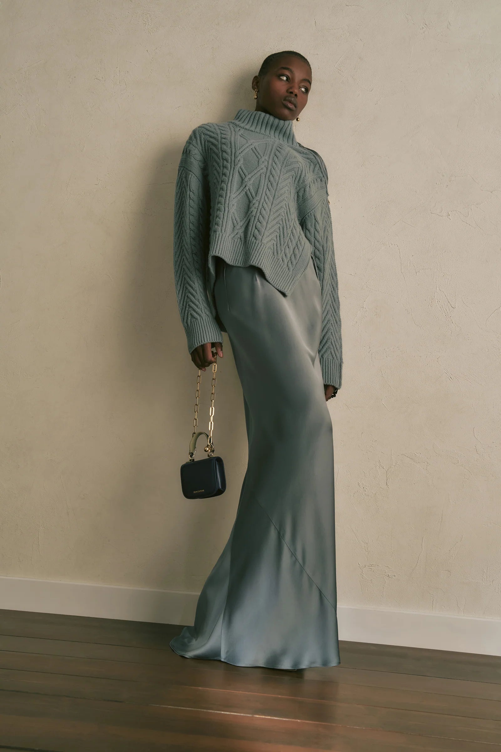 Maglia dolcevita in misto lana a trecce. Modello a manica lunga, dettaglio zip su manica, scollo e fianco. Inserto in raso. Lunghezza bacino, vestibilità  regular.
