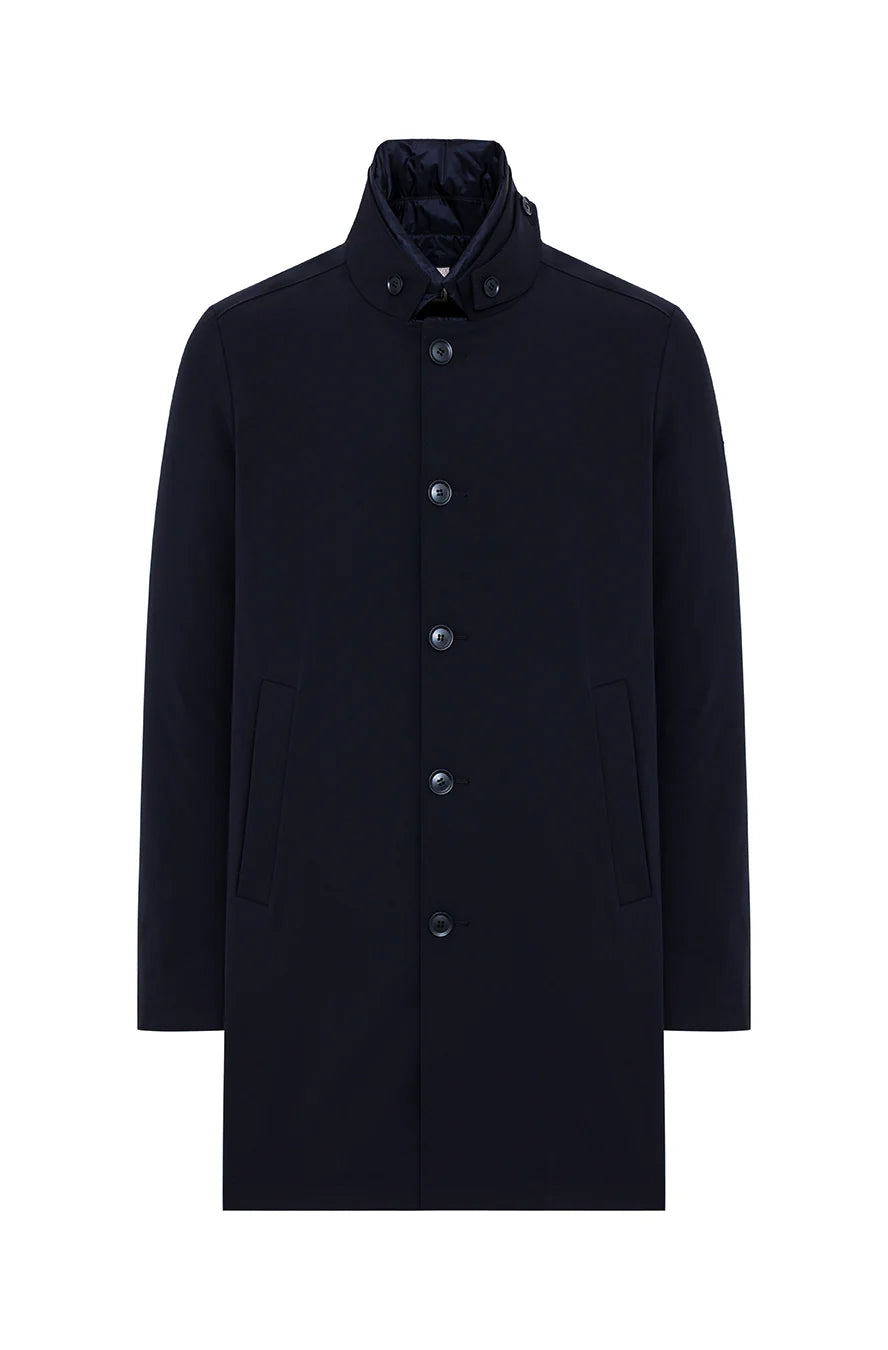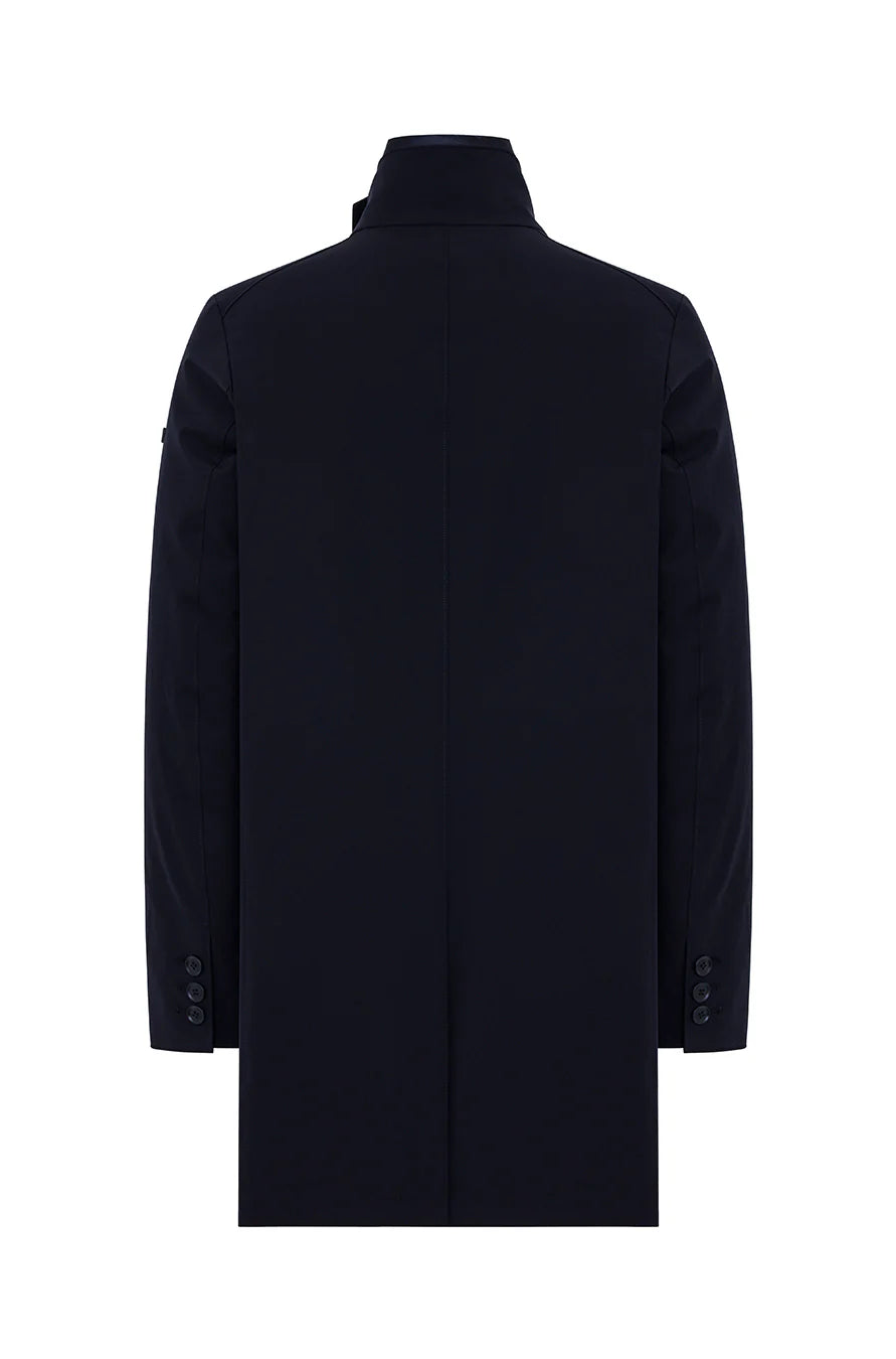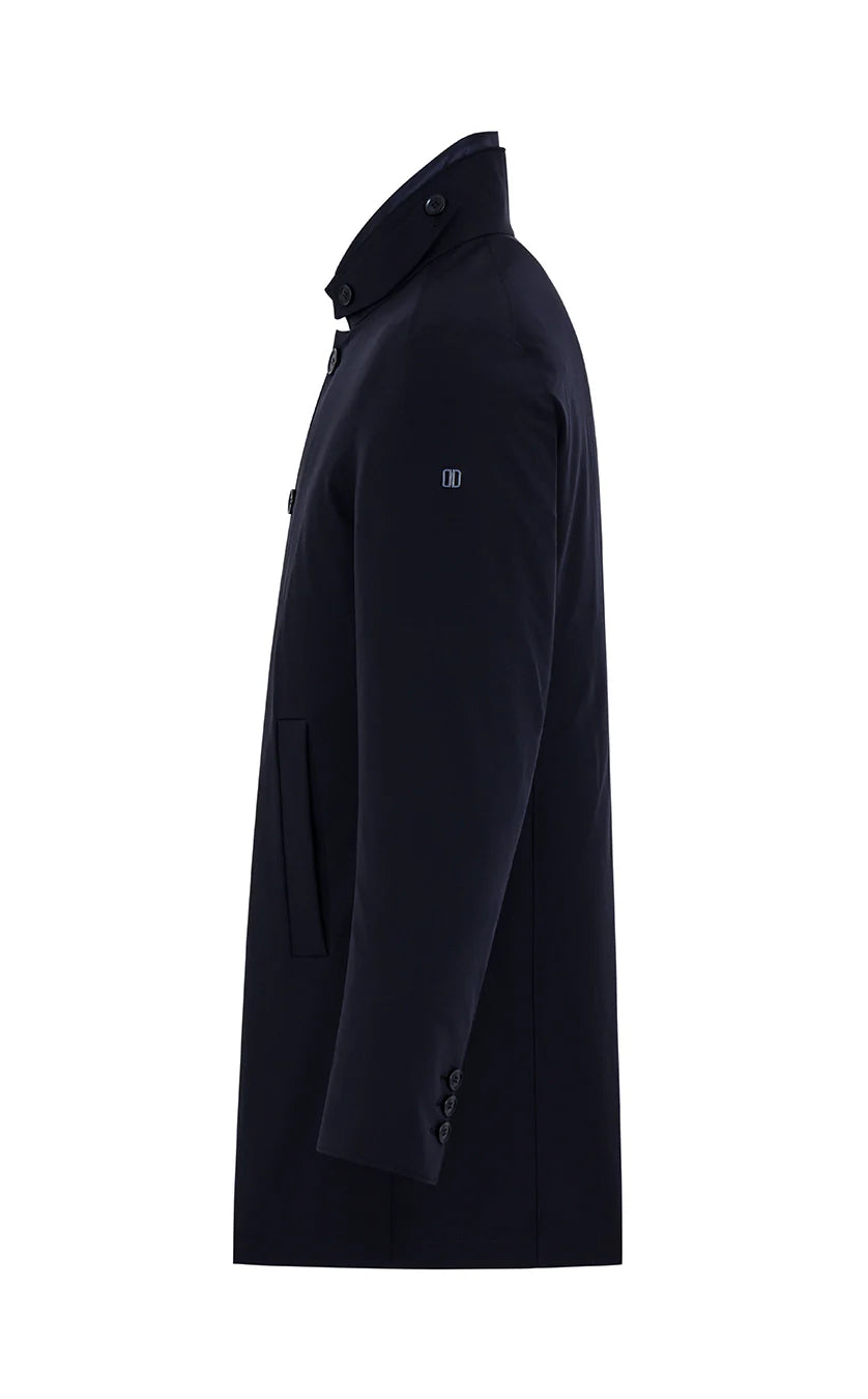 Cappotto in tessuto 2-Layer bi-stretch con imbottitura in piuma, chiusura frontale con bottoni e tasche laterali con filetto. Il capo è caratterizzato da pettorina staccabile con chiusura ad automatici, collo in piedi e dettaglio di laccio sottogola fissato con bottoni. Spacco centrale al fondo dietro con automatico nascosto e fondo manica con spacco e chiusura a tre bottoni. All'interno tasche multifunzione con dettagli catarifrangenti.