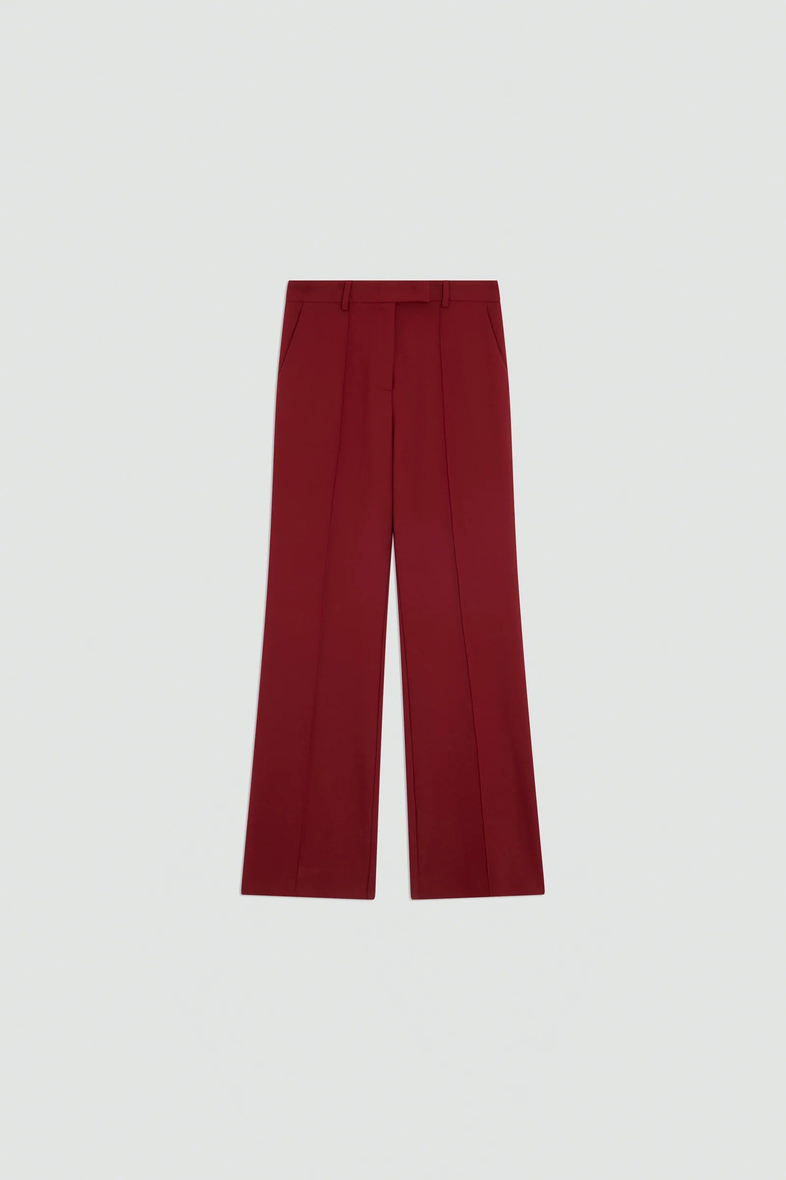 Pantalone in fresco di lana. Modello con fascione, passanti e chiusura gancio uomo. Silhouette svasata. Dettaglio piega stiro. Vestibilità gamba regular.