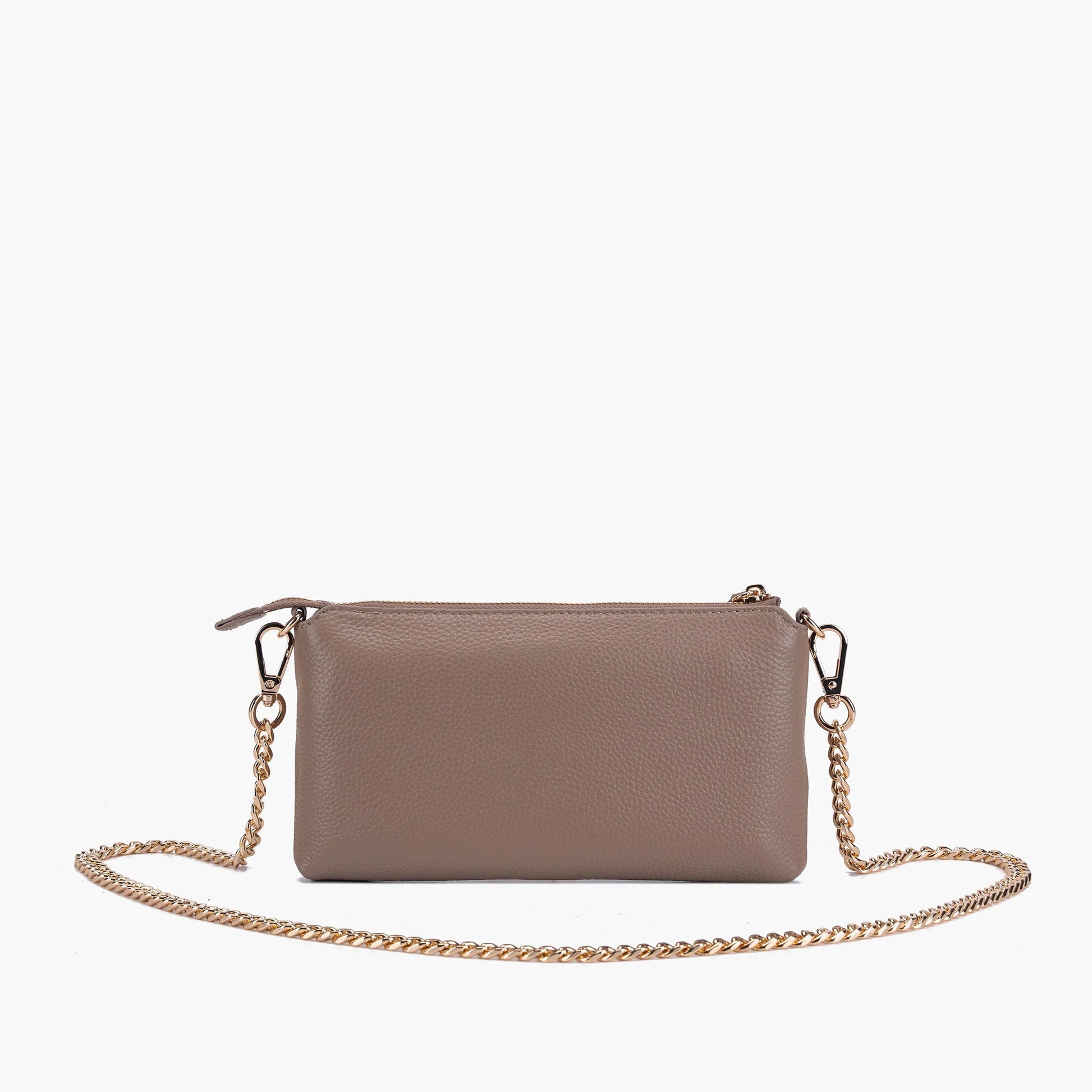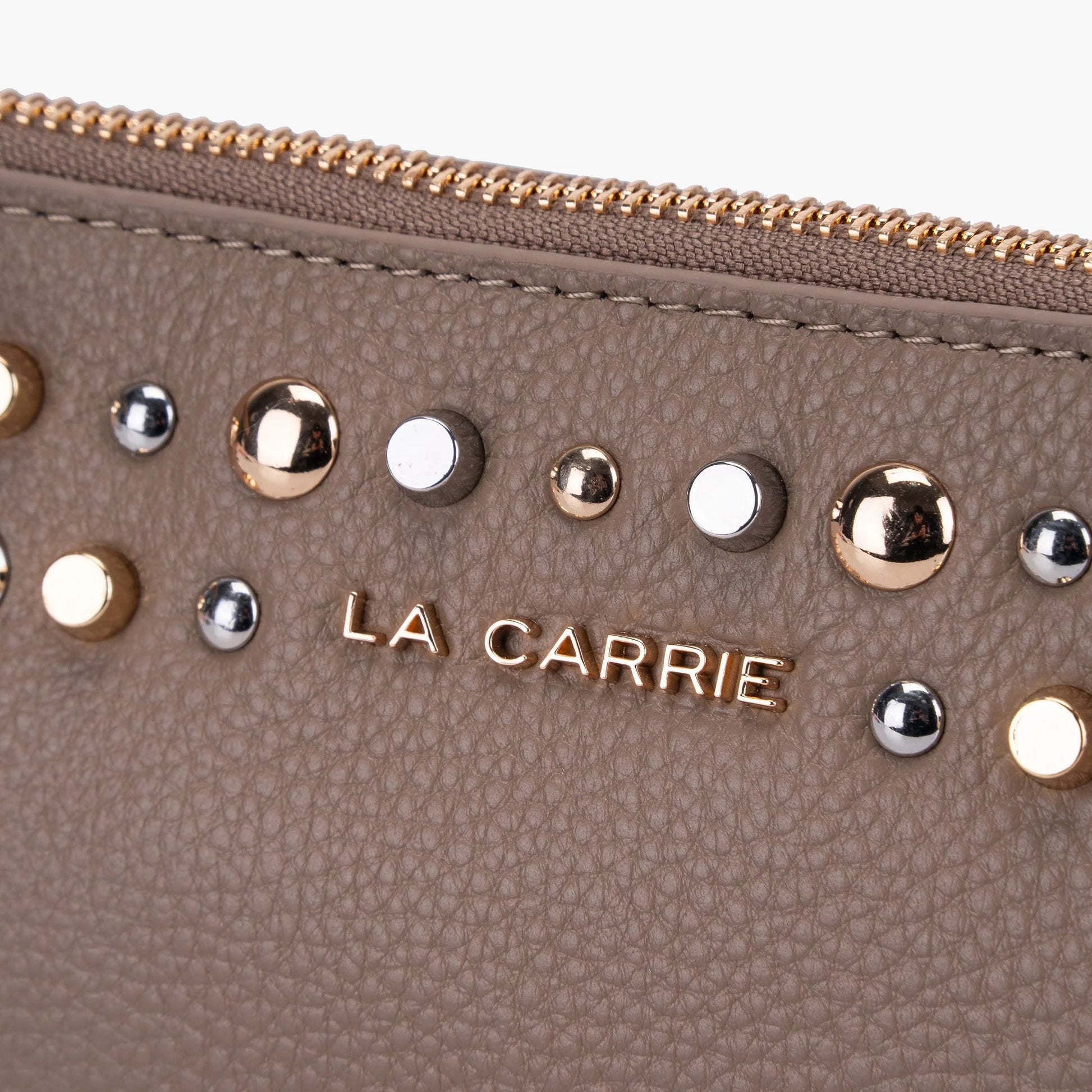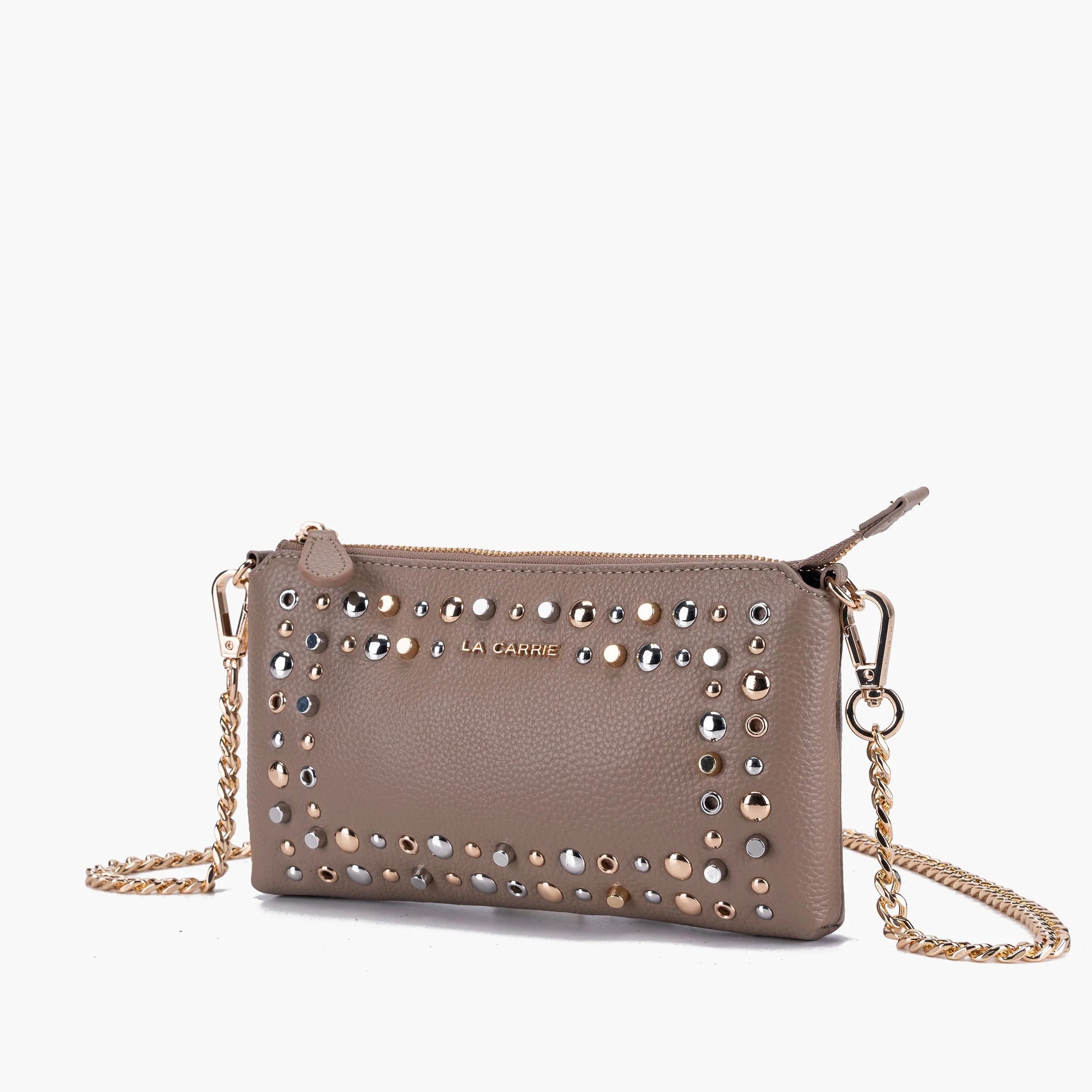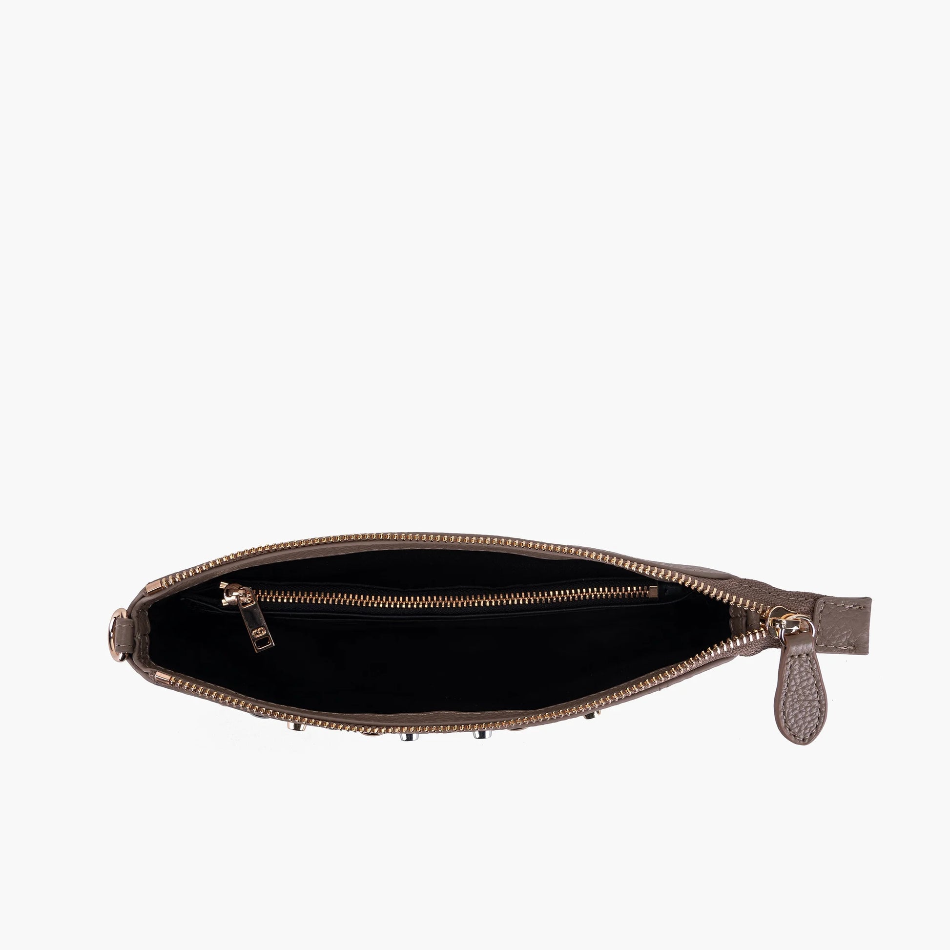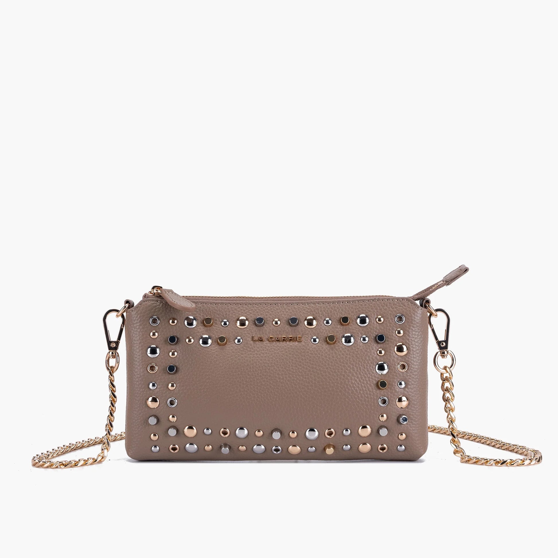 Portafoglio grande in pelle martellata con borchie oro ed argento, chiusura a zip e tracolla rimovibile