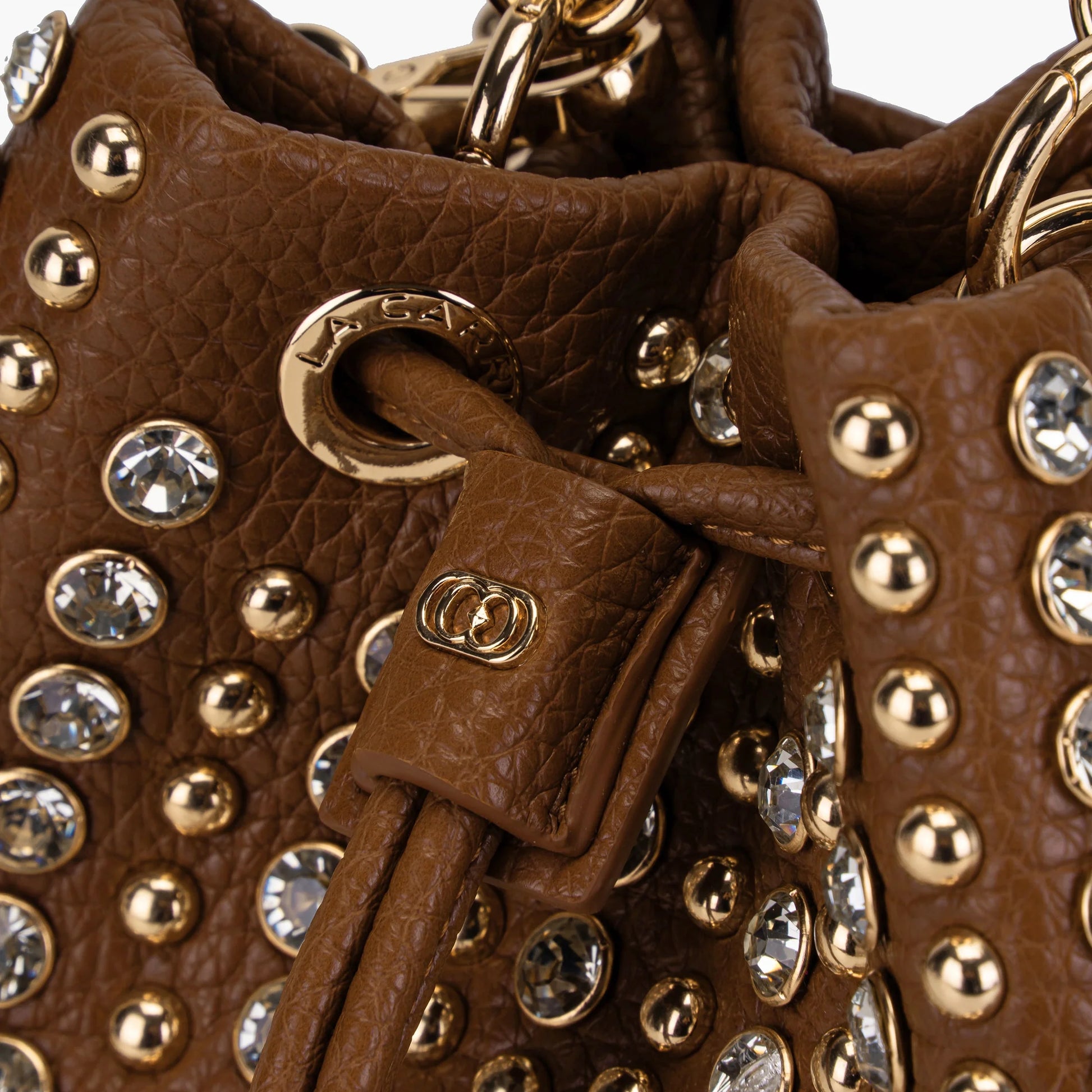 Secchiello Mirror in ecopelle martellata con borchie e strass applicate, manico e tracolla rimovibili